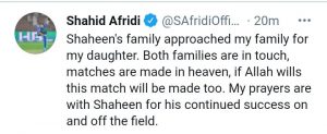 شاهدافریدي د یکشنبې په ورځ په یوه ټویټ کې زیاته کړه چې “جوړې په اسمانونو کې جوړېږي ، که خدای وغواړي ، نو دا رشته به وسئ “