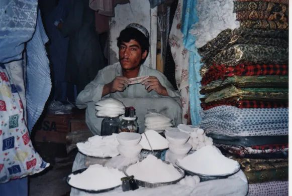د هغه هلک مخ ته سفیده لکه د عام پوډر په شان ډیریو کې پروت و. نه پوهیدم چې دا په کوم وزن خرڅوي؟ هسې په توکل مې وپوښتل، “سفیده په څو ده” هغه هم پوښتنه وکړه چې “څومره غواړې؟ زه د هغه مخ ته پر زمکه کیناستم. ته په کوم وزن خرڅوې؟ وزن! د هغه لپاره ښاري ژبه نا اشنا وه.