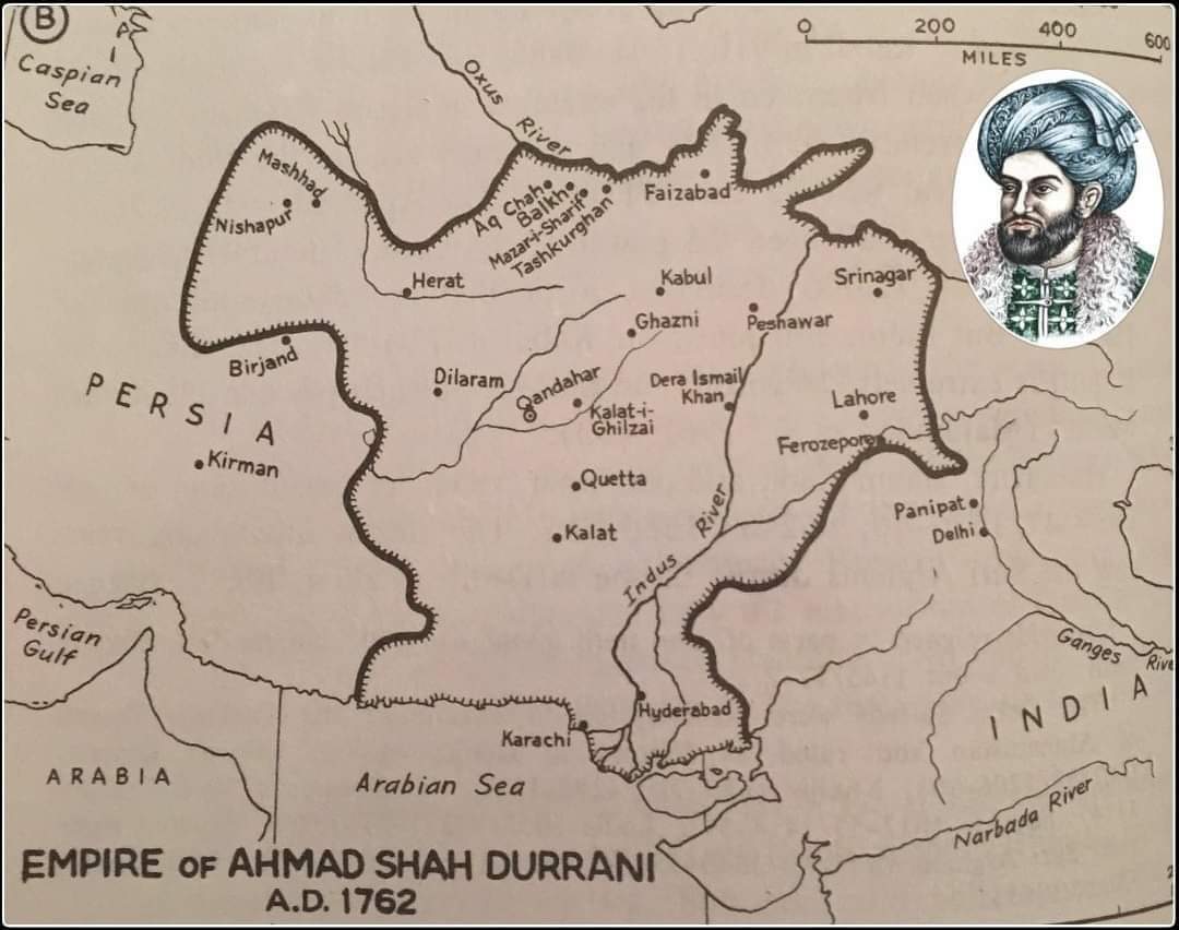 د لوی افغانستان سرحدات د احمدشاه بابا د واکمني پر مهال یو وخت په شرق کي د سرهند نه نیولې، چې د ډهلي په 150 میلۍ کي پروت دی، بیا په غرب کي تر مشهده پورې، چې د حزر دریاب نه په همدې فاصله کي پروت دی رسیدل؛ او پلنوالی ئې د امو له سیند نه نیولې بیا په جنوب کي د فارس تر خلیجه رسیده.