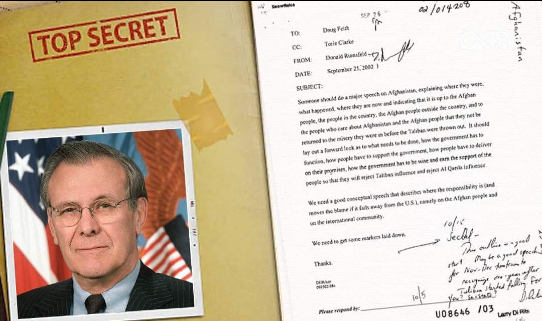 ددغو اسنادو له مخې، د امریکا د دفاع پخواني وزیر ډونالډ رمسفیلډ له خپل هېواد نه د ماتې پړې د اړولو دنده خپلو باوري ملګرو ته سپارلې او ددې کار عملي لارې یې په نښه کړې دي.