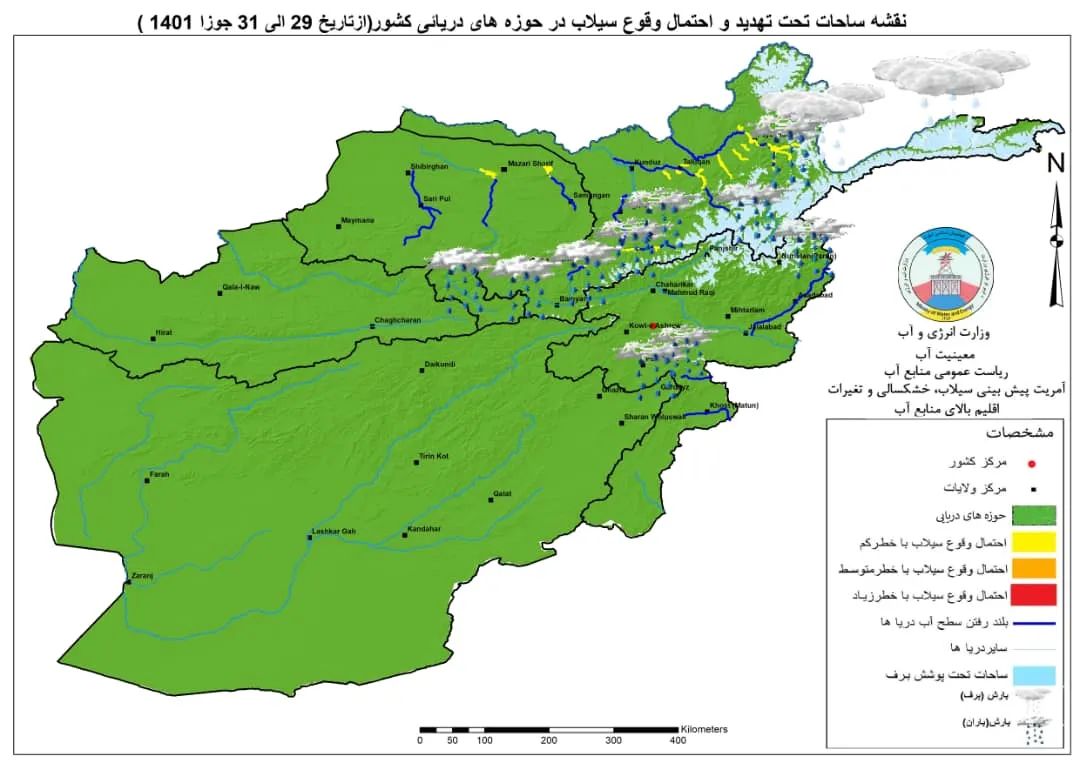 د دغه وزارت د څرګندونو له مخې: له اټکل سره سم به د بارانونو، واورو د ورېدو او د سیندونو د اوبو د سطحې د لوړیدو له کبله به د کوکچې، تخار، بغلان، بامیان، سمنګان، بلخ، سرپل، جوزجان، کونړ او خوست په اړوند سیمو کې سیلابونه رامنځته او د اوبو سطحه لوړه شي.