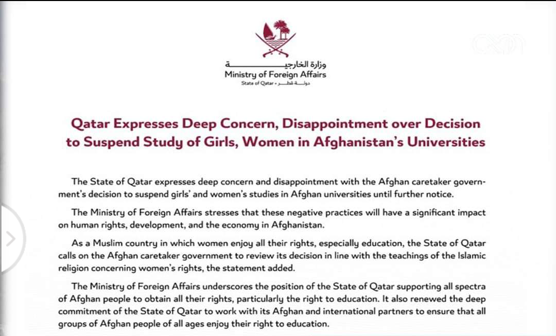د قطر د بهرنیو چارو وزارت په یوه خبرپاڼه کې د طالبانو لخوا د نجونو او ښځو پر زدهکړو بندیز په اړه خپله ژوره اندېښنه او خواشیني څرګنده کړې او ویلي یې دي چې دغه منفي کړنې به د افغانستان پر بشري حقونو، پرمختګ او اقتصاد د پام وړ اغېز وکړي.
