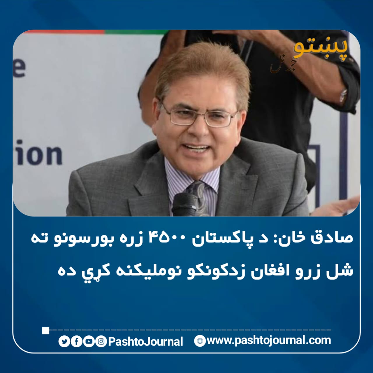 افغانستان دپاره د پاکستان ځانګړي استازي محمد صادق ويلي، پاکستان چې د افغان زده کوونکو دپاره کوم ۴۵۰۰ بورسونه يا سکالرشپونه اعلان کړي، د دغو بورسونو ترلاسه کولو دپاره ۲۰,۸۶۰ زده کوونکو چې پکې ۵۰۱۵ نجونې دي، په ازموينه کې د برخې اخستو دپاره نومليکنه کړې ده.